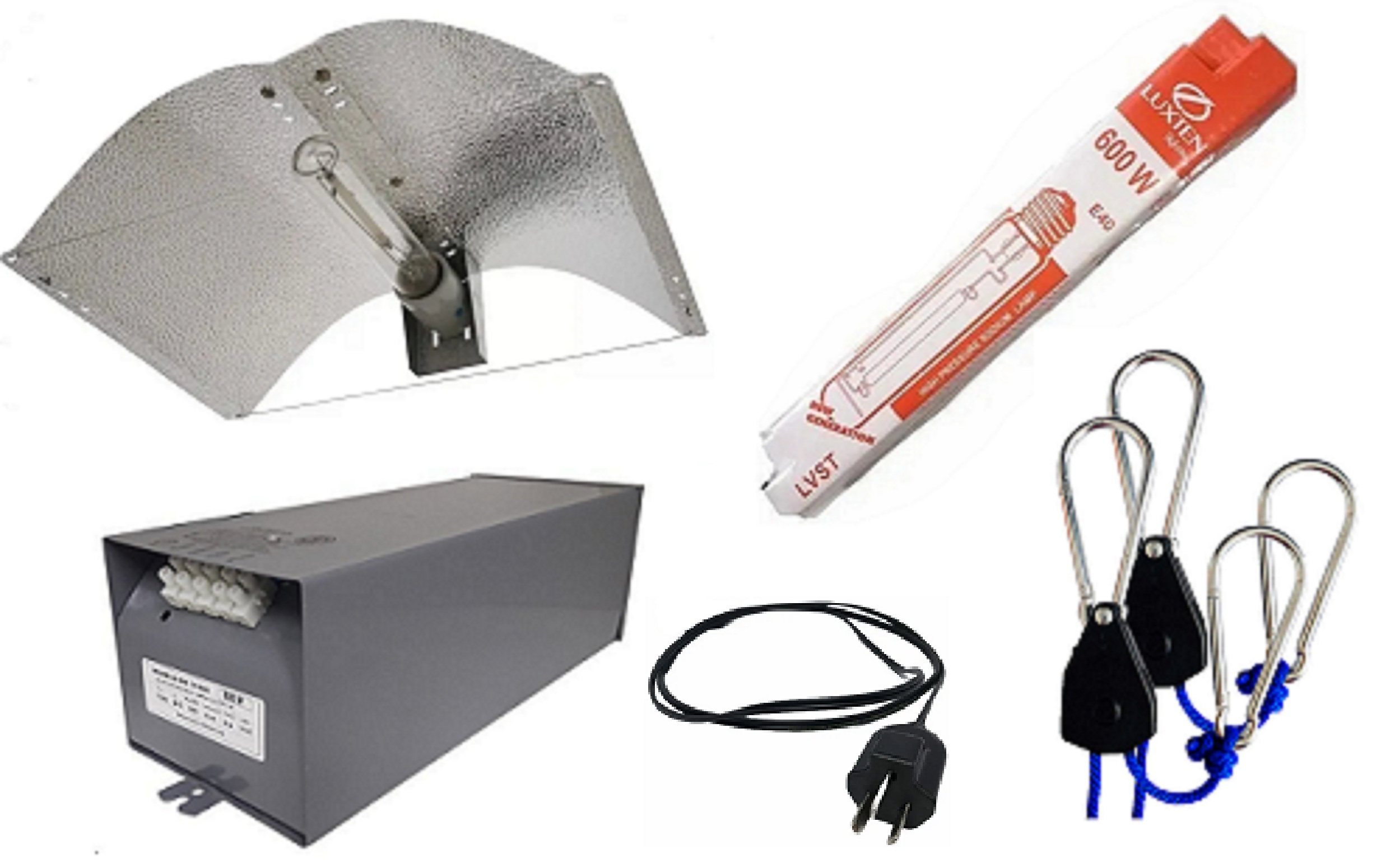 -Balasto Dual Lumens 600w x 1 Apto Sodio Mercurio Industria Nacional( 1 Año de Garantia) , Lampara Luxten 600w x 1, Poleas 68kg x 1 ,Aguila Cannalum #2 x 1 y Cableado